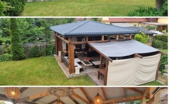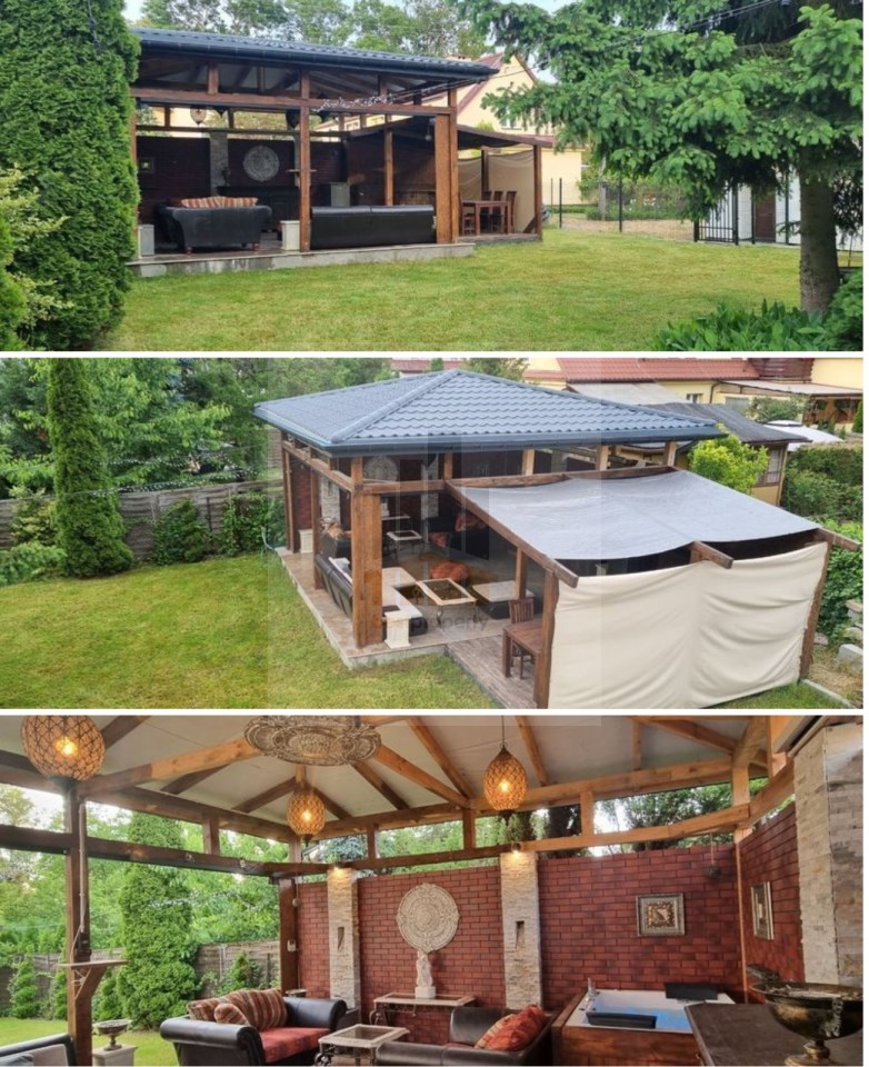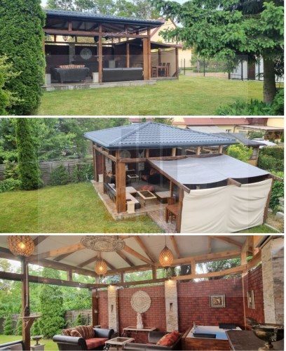 Patio wyposażone w jacuzzi, wysuwany automatycznie ekran do projektora. Na dwóch filarach kamiennych potoki wodne. Idealne miejsce na odpoczynek. Patio 6,5 x 6.5 metra. Posadowione na grubej zbrojonej płycie betonowej. Wewnątrz ściany z cegły klinkier. Na podłodze położone grube płytki. Dokonano zagospodarowania terenu w postaci trawnika z rolki bardzo wysoko gatunkowej. Trawnik posiada system automatycznego nawadniania. W domu i na zewnątrz sieć WIFI.